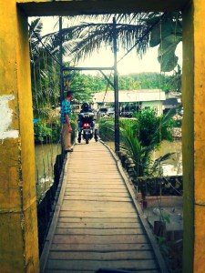 Tadaaaa…. Akhirnya sampai juga di Desa Sawarna. Eiits… Dari gapura utama Desa Sawarna ini, kita harus melewati kali yang dilalui aliran sungai yang sangat deras. Bagaimana melewatinya? Ini yang jadi persoalan. Kita harus masuk ke Desa Sawarna menggunakan jembatan kayu yang disambung dengan tali tambang besar-besar. Jembatan ini hanya bisa dilalui pejalan kaki, sepeda, dan sepeda motor saja. Dan aturannya, hanya bisa satu sepeda atau sepeda motor saja yang bisa melewatinya. Artinya, kita harus bergantian untuk melalui jembatan itu.